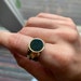 This wonderful stately and substantial bloodstone ring can be worn by a man or a woman. The round bloodstone, which is a deep rich green with many specks of bright red, is bezel set in a heavy 14 karat yellow gold shank. Bloodstone is the ancient birthstone for March. Throughout the ages it was often used to make seals and amulets. The stone was also believed to have healing powers.